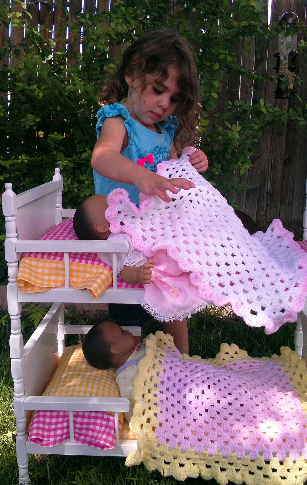 These are, once again, my favorite giant granny square afghan pattern. Fifteen rows and an edging is enough to cover a baby doll...but these still took most of my crafting time Tuesday and Wednesday to finish up. They are each a little different, I like them both. Thought about making matching ones, or contrasting like the sheets and pillows...but I got a little tired of that and had to play...so here they are...
